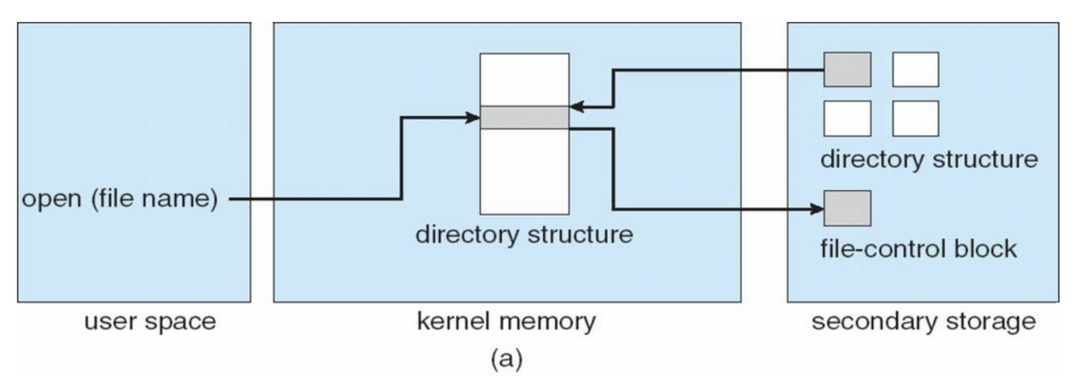 - 파일 제어 블록(file control block, FCB) 는 소유, 허가 그리고 파일 내용의 위치를 포함하여 파일에 관한 정보를 가지고있다.