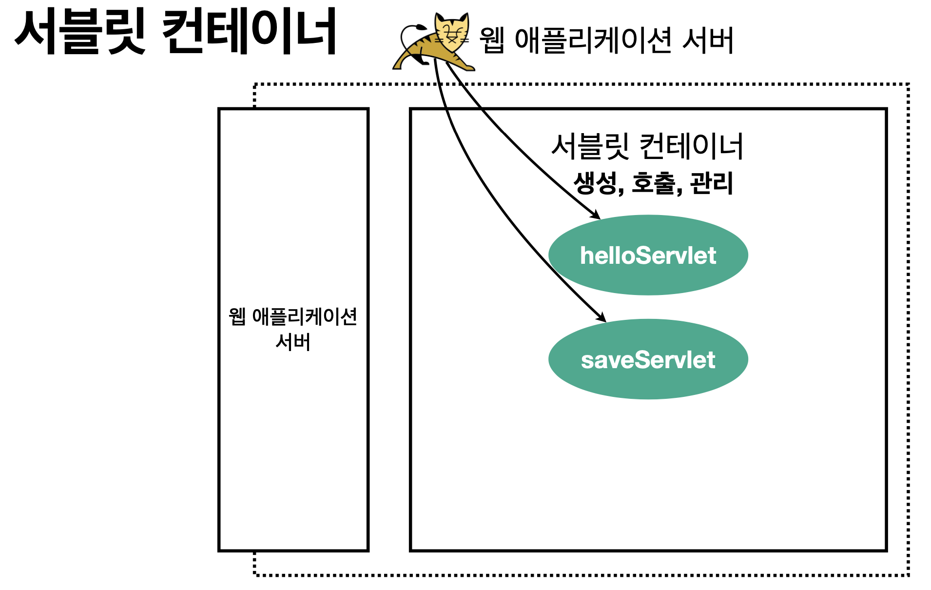 - 톰캣처럼 서블릿을 지원하는 WAS를 서블릿 컨테이너라고 함