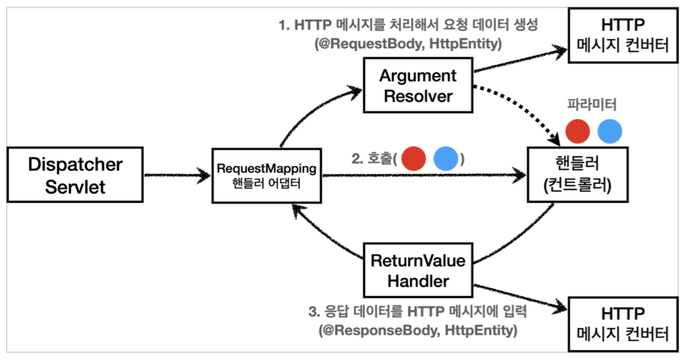 - 응답의 경우 ReturnValueHandler를 통해 HTTP 메세지 컨버터를 호출해서 응답 결과를 만든다.