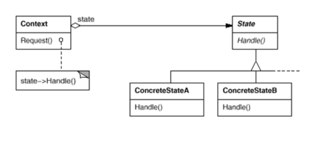 - ConcreateState : 각 상태 클래스가 수행할 State에 선언된 메서드를 구현한다.