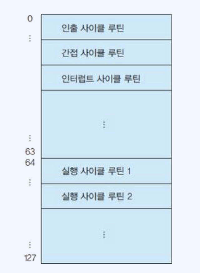 - 명령어의 연산코드 OP code만 해독해서 연산을 수행하기 위한 루틴의 시작 주소 지정