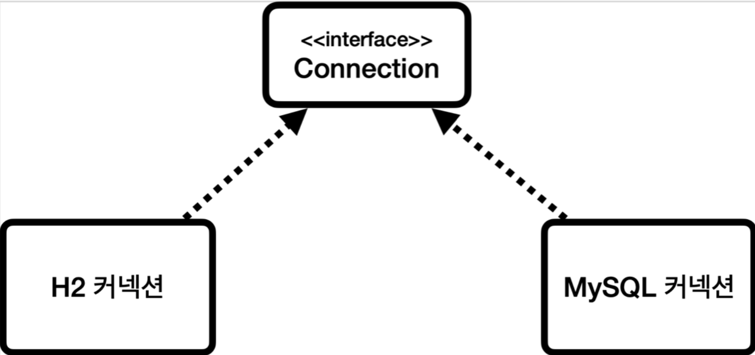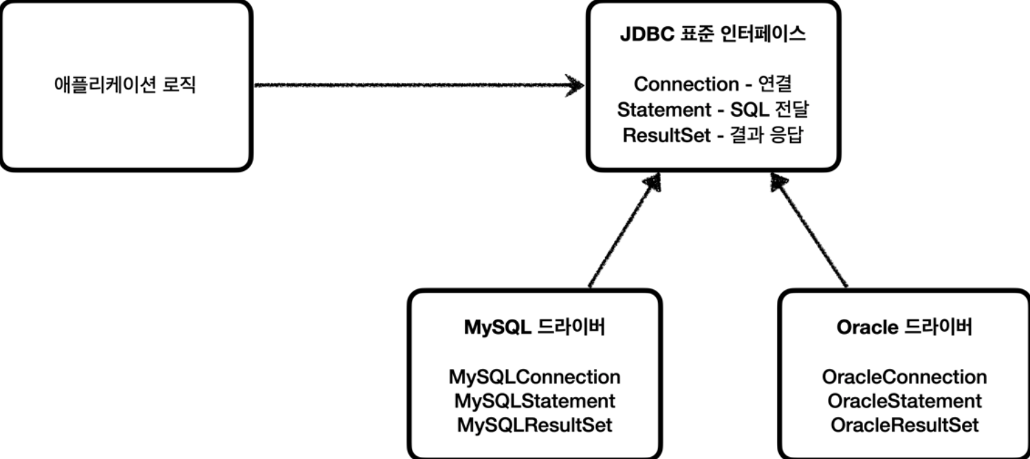 - JDBC 표준 인터페이스에 의존하게 하여 데이터베이스를 다른 종류의 데이터베이스로 변경하면 애플리케이션 서버의 데이터베이스 사용 코드도 함께 변경해야하는 문제를 해결한다.