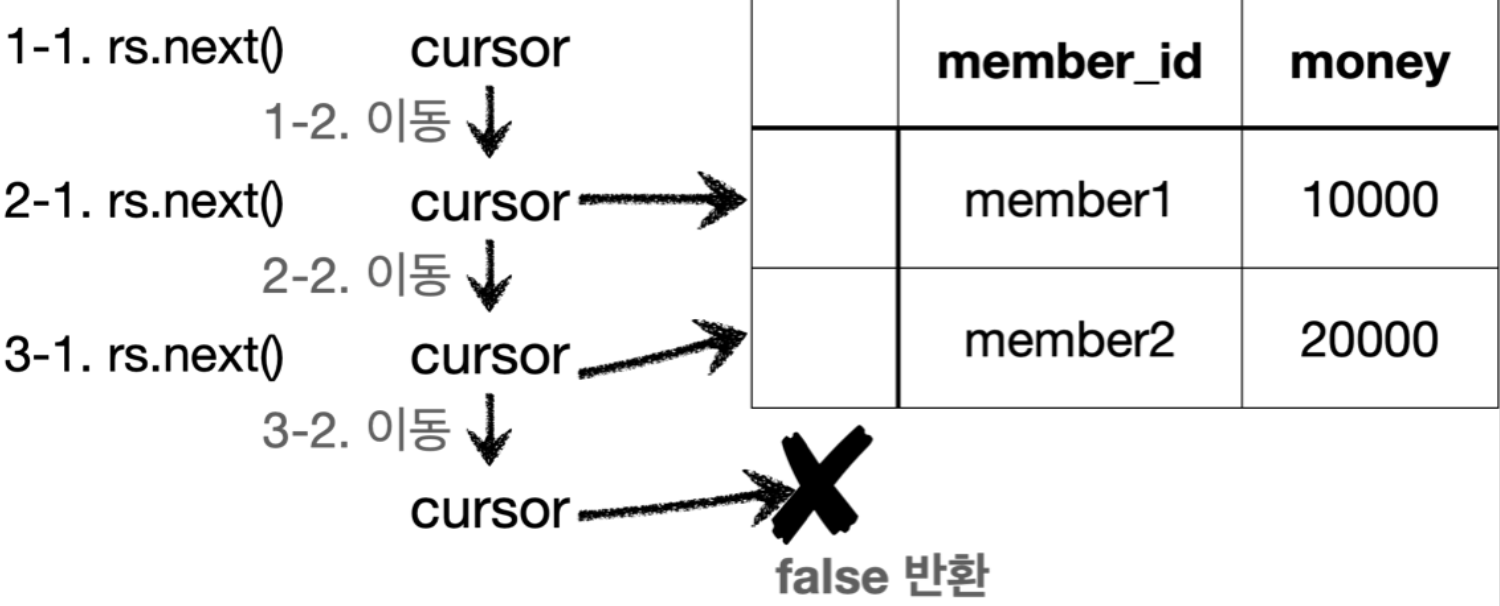 - ResultSet 내부에 있는 커서를 이동해서 다음 데이터를 조회할 수 있다.