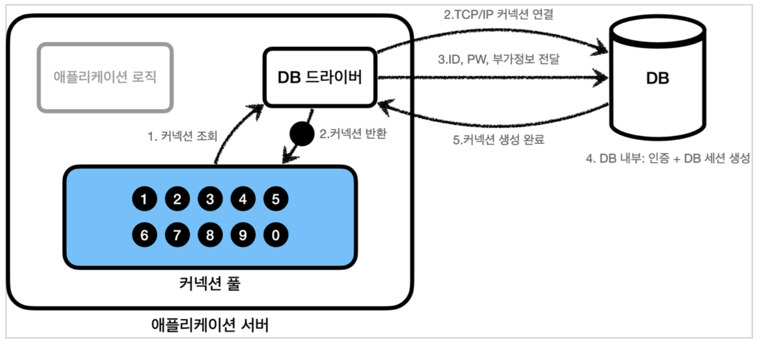 - 데이터베이스 커넥션을 획득할 때마다 tcp/ip 커넥션 (3 way handshake)을 연결하는 네트워크 동작이 발생되어 커넥션을 생성하기 위한 리소스를 매번 사용해야 한다.