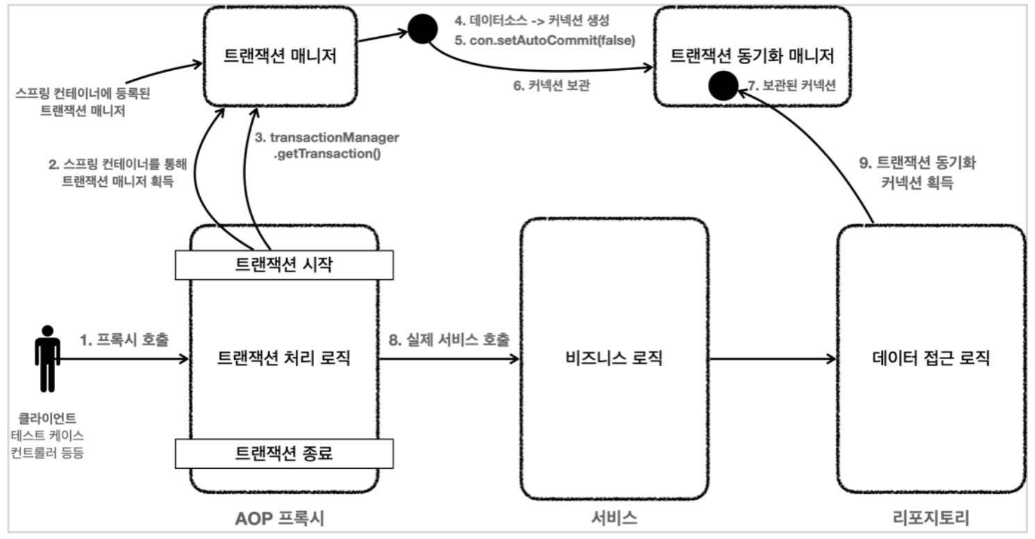 - 2. 트랜잭션 매니저는 트랜잭션이 시작된 커넥션을 트랜잭션 동기화 매니저에 보관한다.