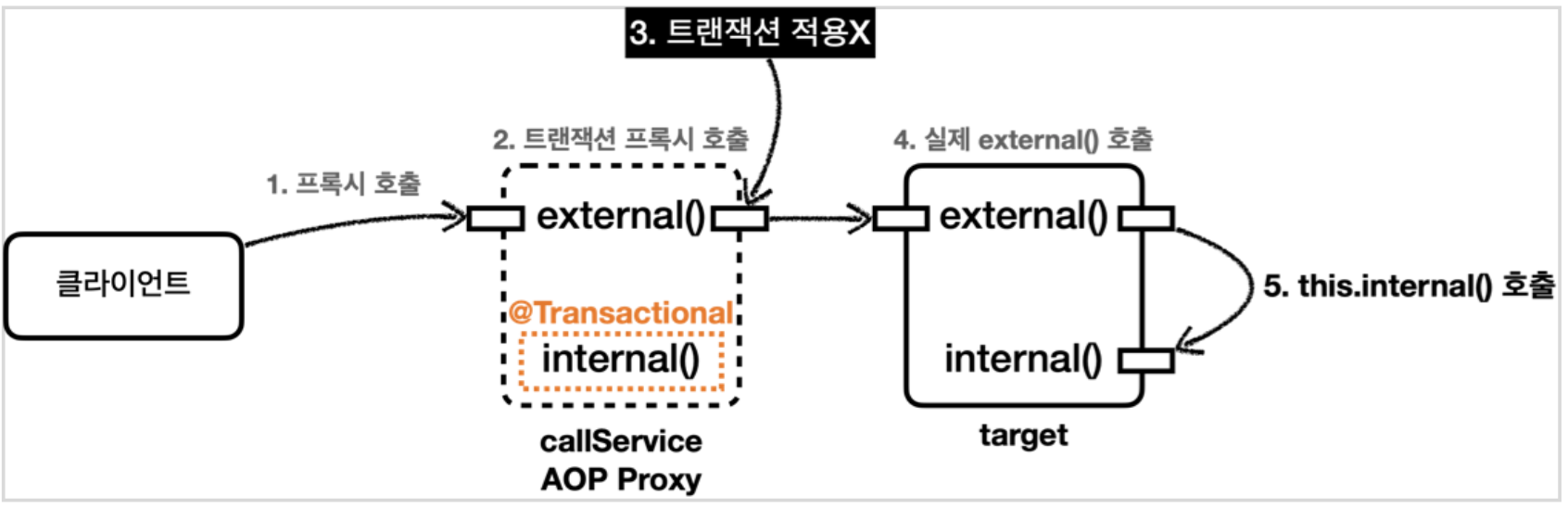 - 트랜잭션을 적용하지 않고 실제 객체 인스턴스의 external() 을 호출한다.