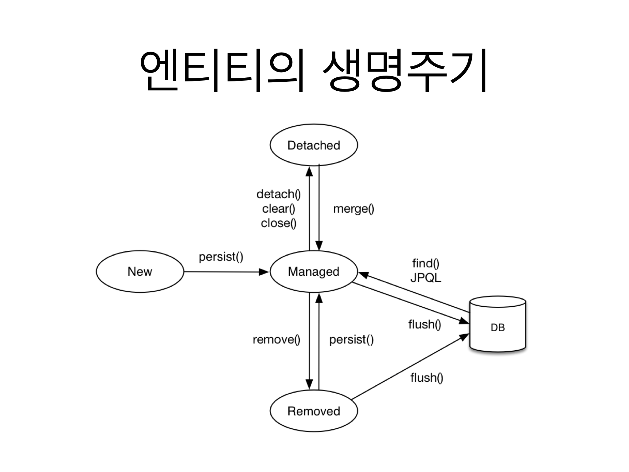 - 만약 엔티티를 persist로 저장하고 jpql 로 select 조회했을 때 플러시가 실행되지 않는다면 조회할 수 없다. (아직 커밋으로 db에 저장되지 않았기 때문에) 하여 jpql 실행 전에 flush로 db와 동기화한다.