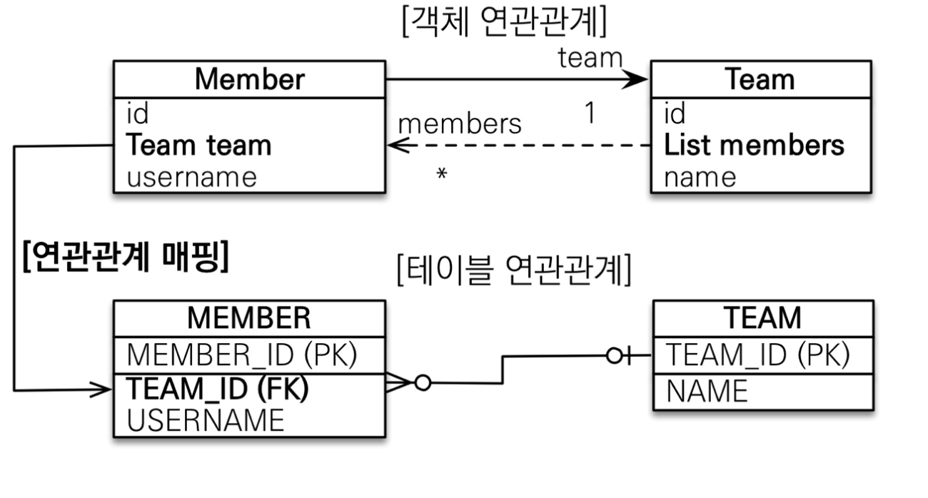 - 객체와 테이블의 차이 떄문에 반대편 테이블의 외래 키를 관리하는 특이한 구조