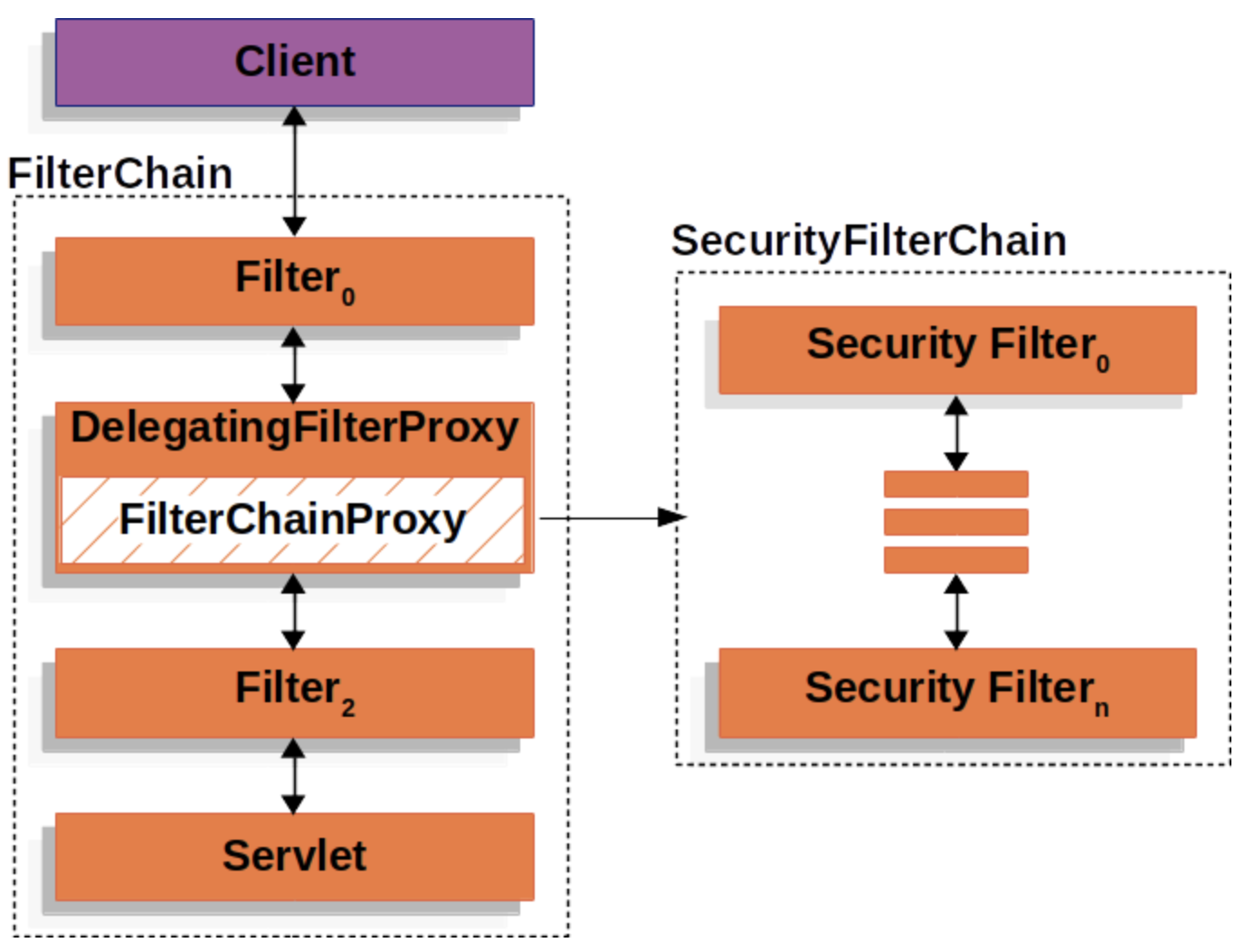 - 위의 figure는 DelegatingFilterProxy가 어떻게 여러 Filter로 구성된 FilterChain에 껴들어 가는지 보여준다.
