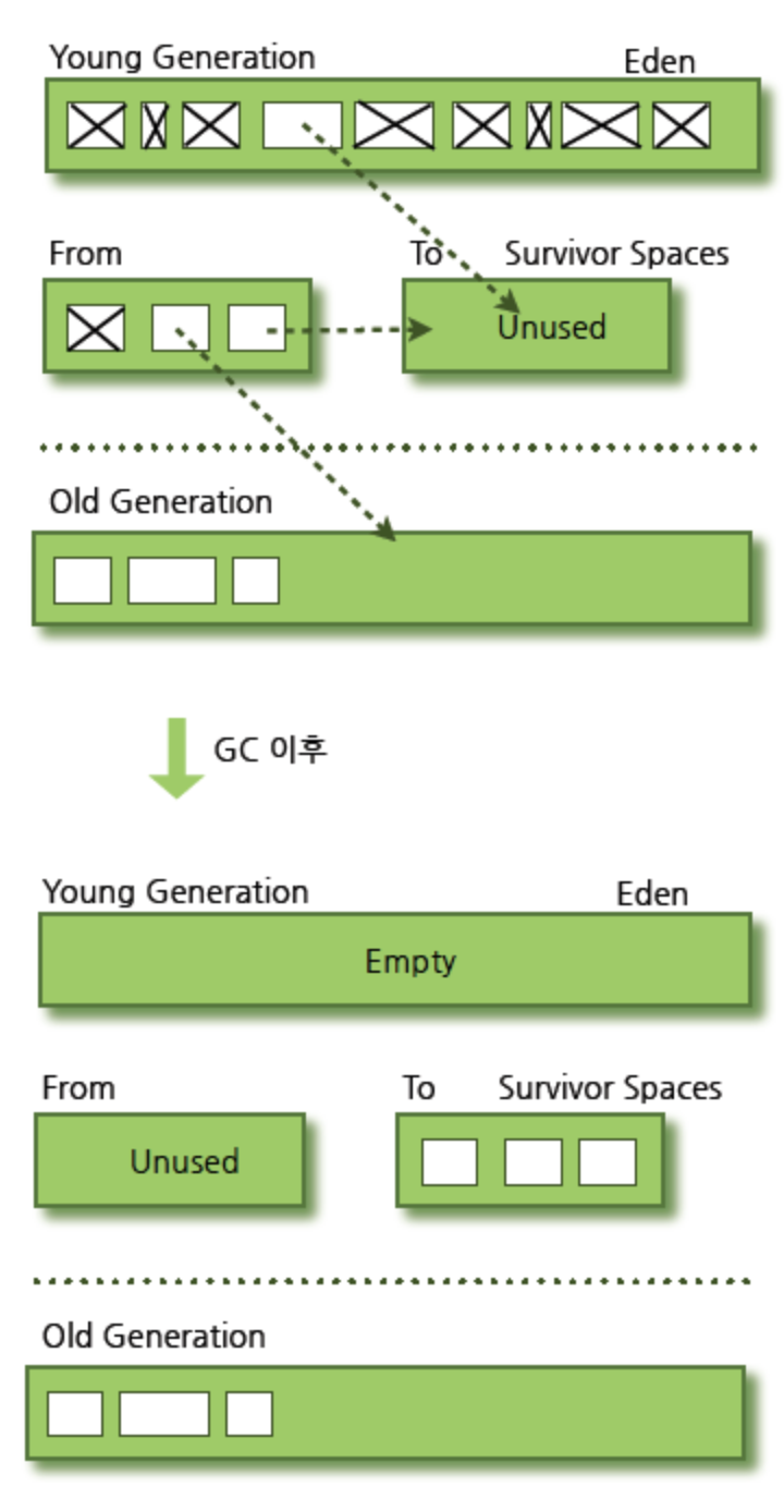 - Eden 영역에서 GC가 한 번 발생한 후 살아남은 객체는 Survivor 영역 중 하나로 이동한다.