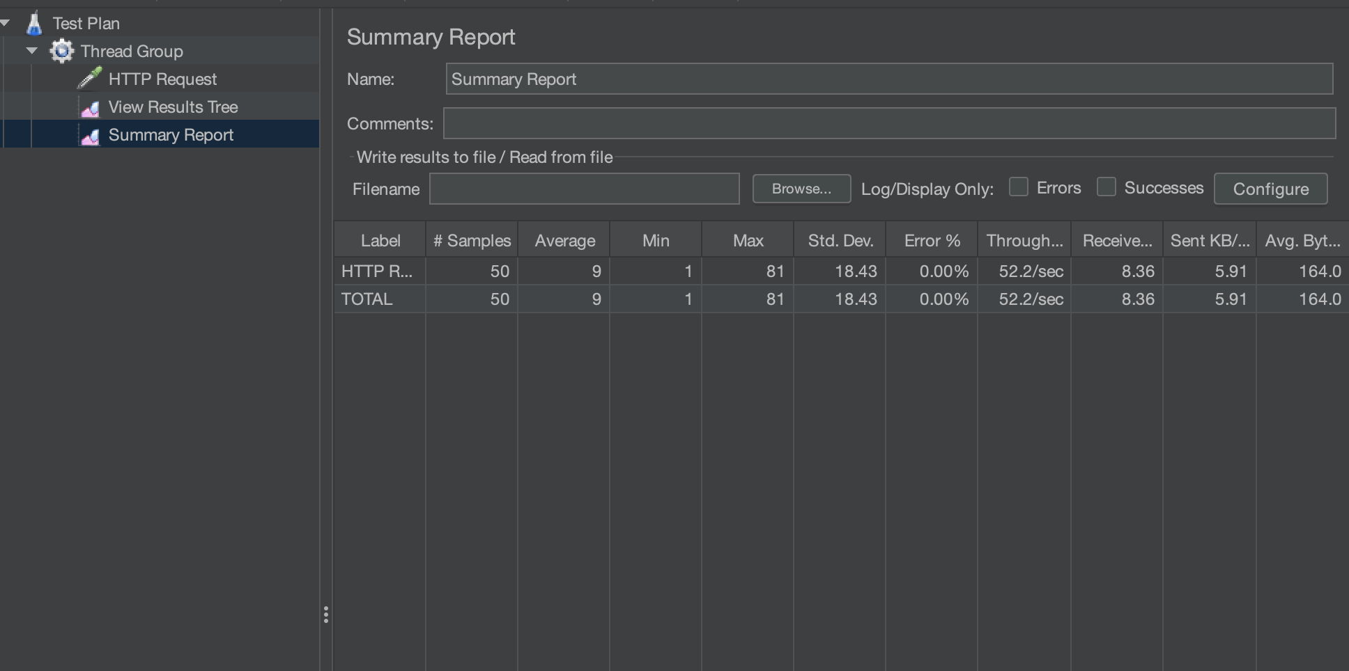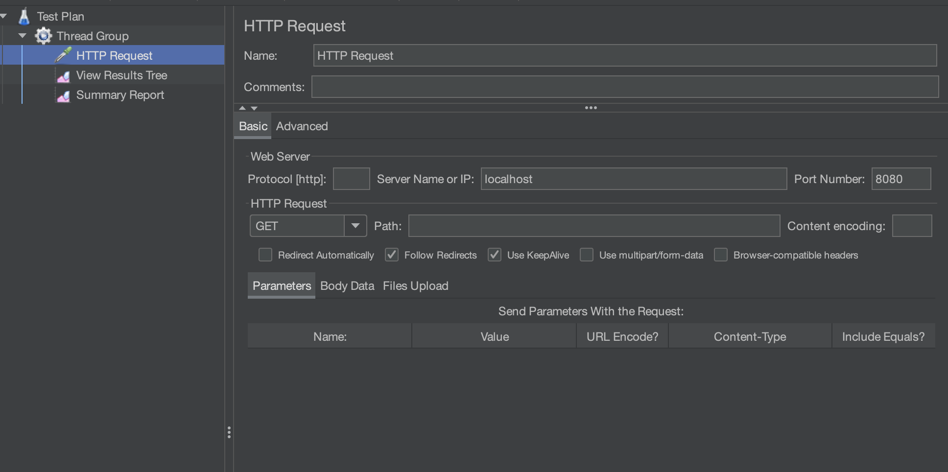 - HTTP Request 에서 우리의 도메인과 포트, Request 등을 설정하고 Start를 누른다.