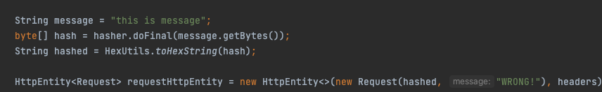 - hashing 할 때 쓴 message 와 httpentity 를 생성하며 만든 message가 다른 것으로 변조되었다는 것을 가정합니다.