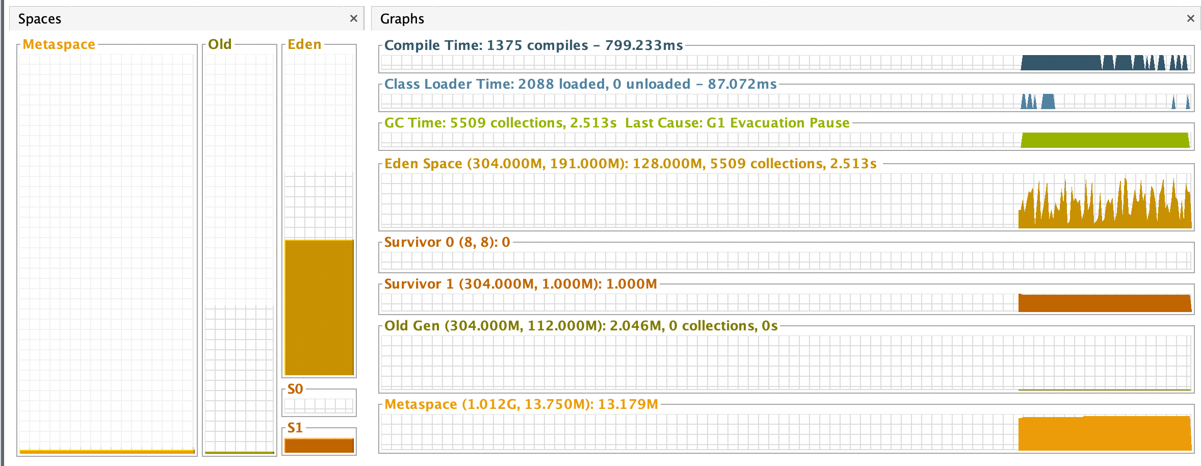 또한 gc 의 현황을 보게되면, Eden Space 에서 대부분 생성되었다가 사라지는 것을 볼 수 있습니다.