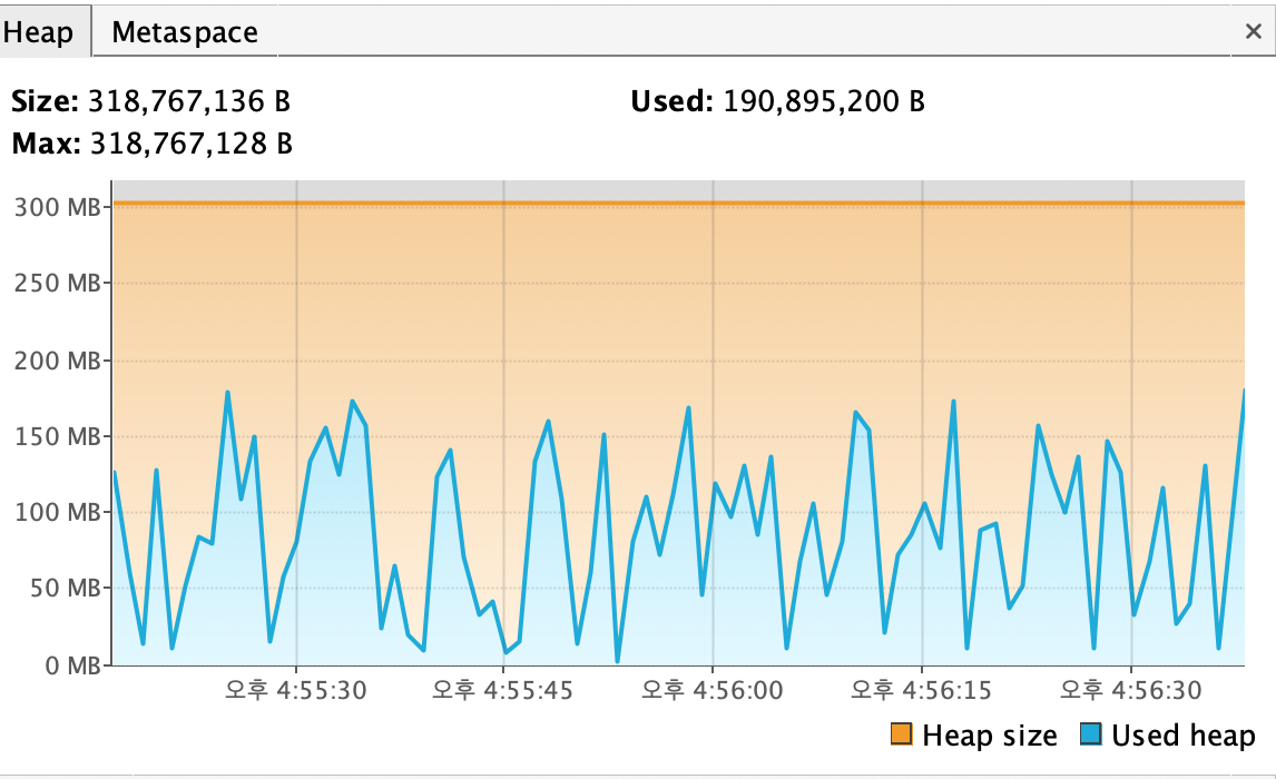 실제로 실행해본다면 꽤 짧은 시간 안에 OOME 가 발생하는 것을 확인하실 수 있을 것입니다.