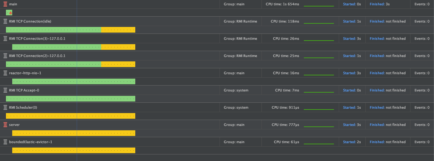실행 전 Yourkit 으로 thread 의 활동을 확인합니다.