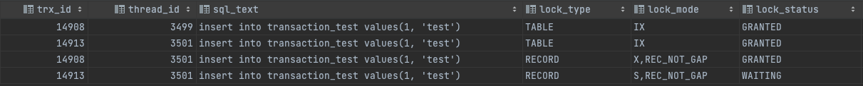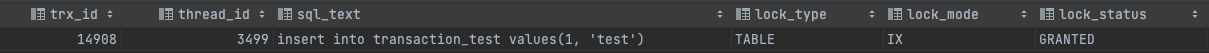 transaction id 14908 로 테이블에 IX-Lock 을 설정한 것을 확인할 수 있습니다.