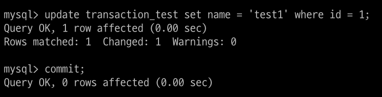 Transaction B 에서는 name 을 test1 로 변경하여 commit 합니다.