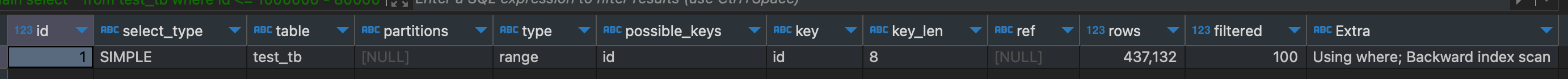 앞서 살펴본 실행계획에 따르면, 모든 레코드를 테이블에서 가져와 id 를 기준으로 역순 정렬하고