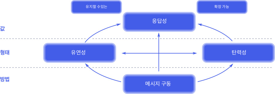- 메세지 구동 : 비동기 메세지 전달에 의존하여 구성요소 간 느슨한 결합, 격리, 위치투명성을 보장