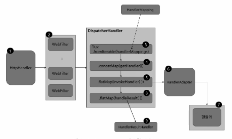 - DispatcherServlet 과 유사한 DispatcherHandler 는 HandlerMapping List 를 원본 Flux 의 소스로 전달 받음
