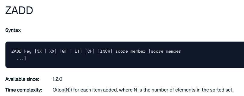 SortedSet 의 zadd 는 O(log^n) 의 복잡도를 가지고 있습니다.