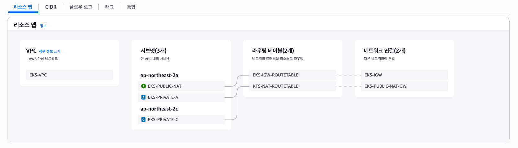 따라서 EKS-PUBLIC-NAT, EKS-PRIVATE-A 는 ap-northeast-2a 에 같은 영역에 있고,