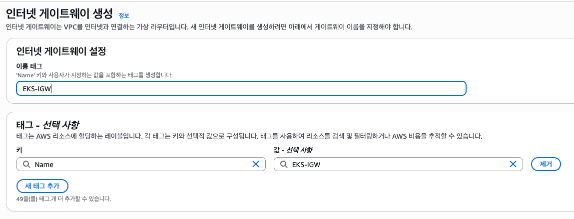 인터넷 게이트웨이를 생성합니다. 위에서 설명했듯 앞으로 인터넷 외부 통신은 이 gateway 를 통해 이뤄집니다.