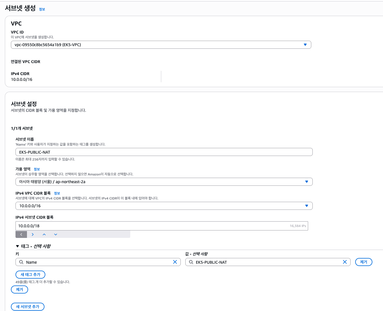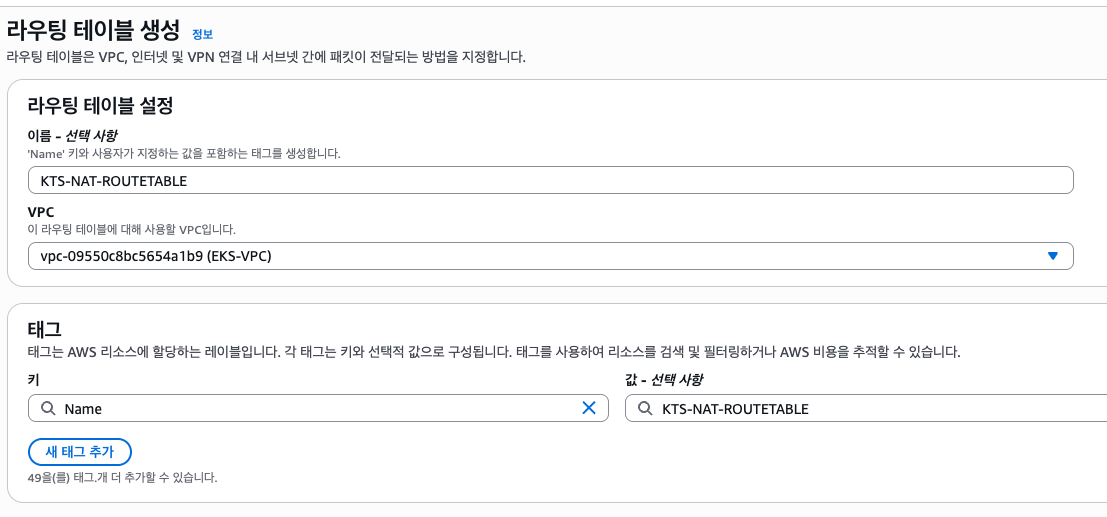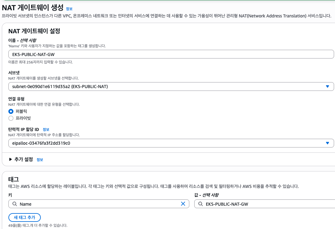EKS-PUBLIC-NAT 에 위와 같은 태그를 추가합니다.