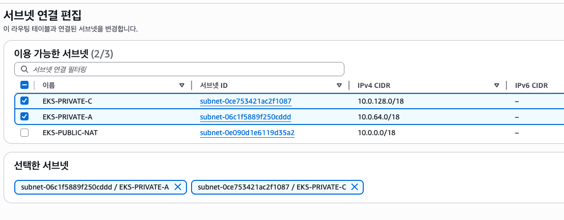 위와 같이 NAT Routetable 을 생성한 이후 private subnet 2개를 연결해줍니다.
