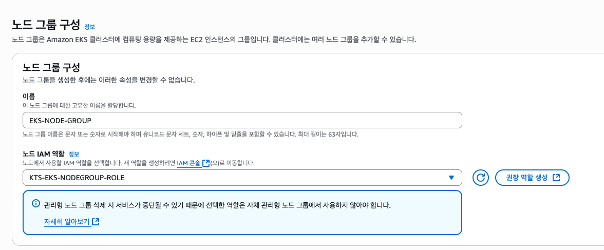 다만 클러스터 IAM 역할, 노드 IAM 역할은 권장 역할 생성으로 할 수 있습니다.
