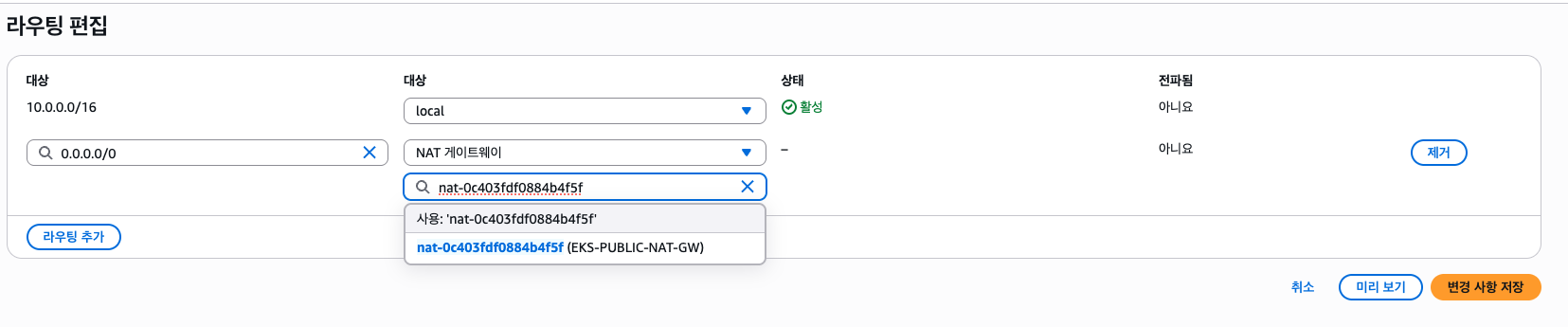 이후 라우팅 편집을 통해 모든 외부 통신을 NAT GW 에 할 수 있게 합니다.