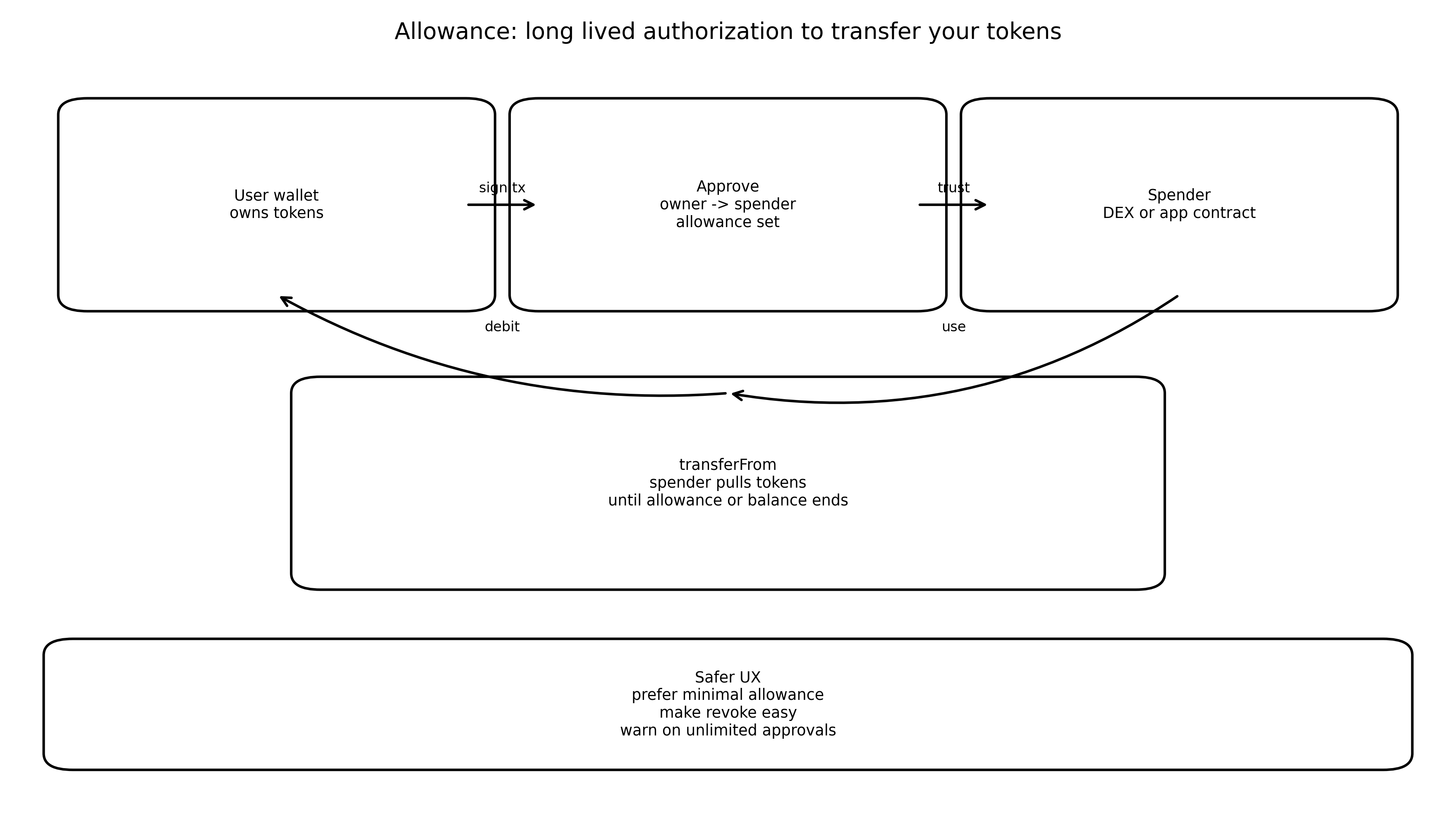 - 승인 allowance는 장기 권한 위임이고, 실수하면 자동이체 권한을 넘겨준 것과 같다