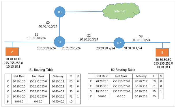 - 수신처 네트워크, 중계지점, 메트릭, 수신처의 출구가 기재되어 있다.