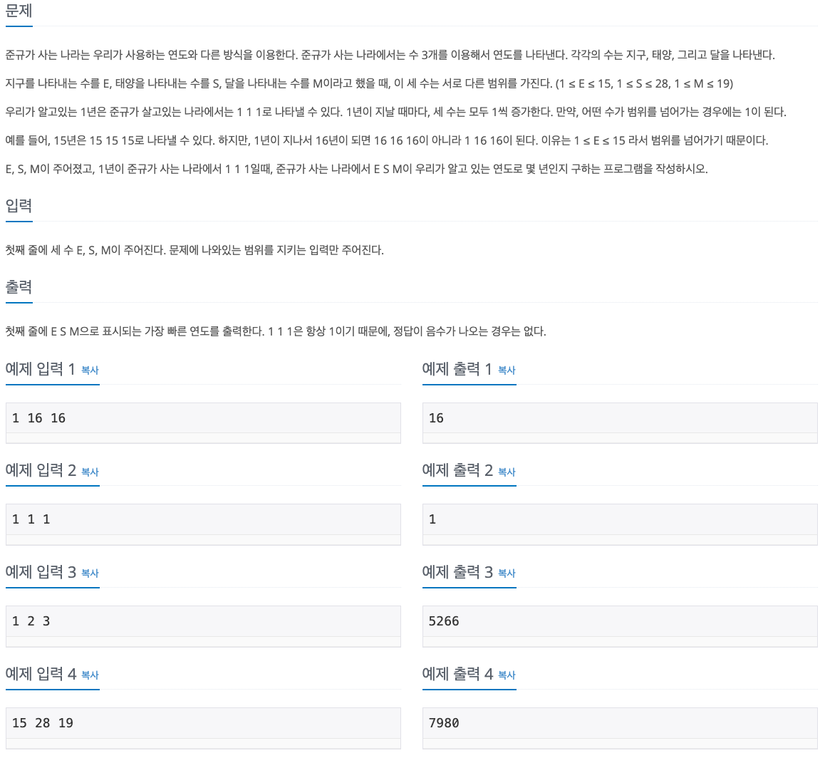 다만 그것들에 대한 나머지만 주어지기 때문에 브루트포스를 이용하여 년도를 계속 더해주는 방식으로 풀이했다.