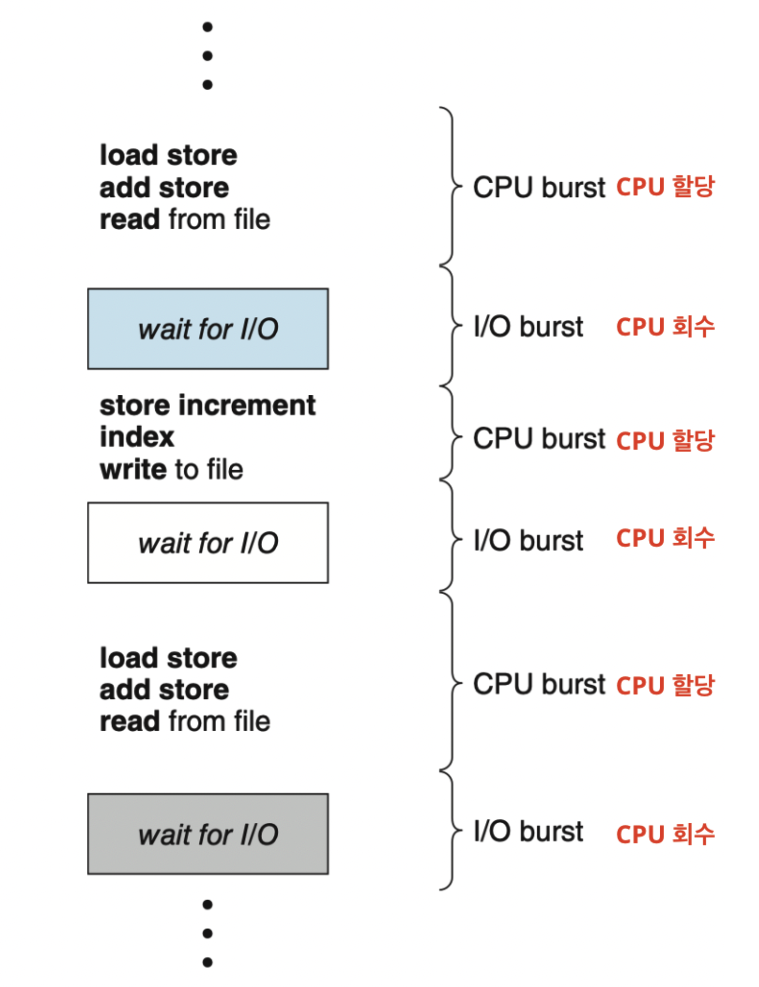 - 단일 코어라면, 빨간 박스의 상태에서 CPU는 I/O 요청이 완료될 때까지 유휴상태를 갖는다. -> 비효율적!