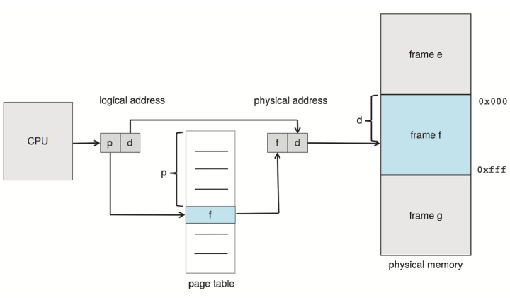 - cpu가 생성하는 논리주소는 Page number(p, 페이지 테이블 인덱스) + Page offset(d, 페이지 내 offset)로 이뤄져 있다.